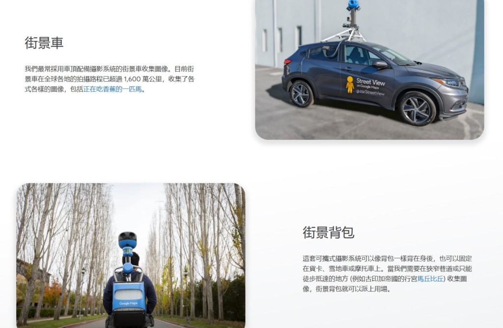 根據《TVBS新聞網》、《今日新聞》報導,Google Maps之所以能呈現如此完整的街景資訊,主要仰賴「街景車」與「街景背包」兩大利器。其中街景背包屬於可攜式攝影系統,重達18至20公斤、高約120公分,內建15顆鏡頭、一台小型電腦及電池組,可依需求固定於貨卡、雪地車或機車上。這套設備專門用於車輛無法抵達的狹窄巷弄,或僅能步行前往的景點,例如秘魯的馬丘比丘古蹟等地,都是靠工作人員徒步揹著背包一步步記錄而成。