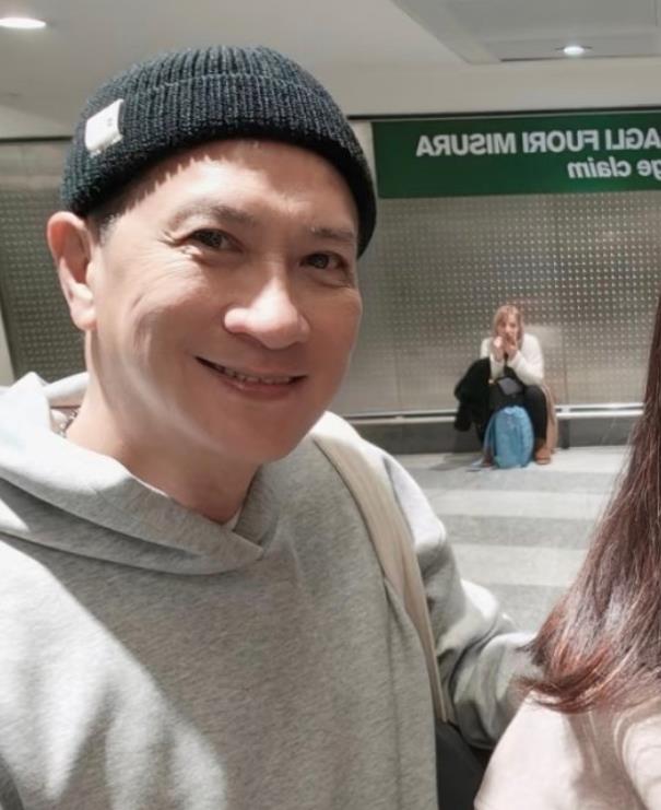 姐姐狀態真好,發量濃密且狀態自然。老公張家輝拿著機票護照站在旁邊,戴著帽子的他狀態也特別好。