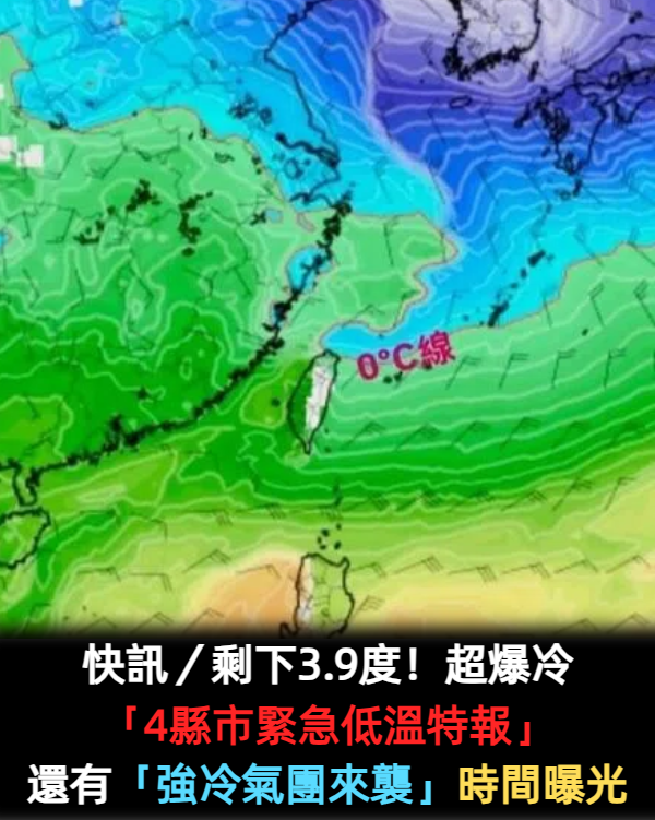 快訊/剩下3.9度!超爆冷「4縣市緊急低溫特報」 還有一波「強冷氣團來襲」時間曝光 Elmo 2026-01-10 檢舉 圖片來源:《TVBS》面對持續的低溫天氣,網友們紛紛在社群媒體上互相提醒:「出門記得多穿幾件,洋蔥式穿法最保暖」、「家裡有長輩小孩要特別注意保暖措施」、「使用電暖器要保持通風,注意用電安全」、「早起運動的朋友建議等太陽出來再出門」、「機車族別忘了戴手套圍巾,小心別感冒了」。影片來源:自由時報電子報資料來源:《ETtoday》 Advertisements 回首頁 2/2 Advertisements 猜你會喜歡 睡覺也冷到發抖!寒流來襲「日本三明治蓋被法」再翻紅 網友實測狂讚「再加一神物」暖到流汗 低溫探5度冷爆!氣象局曝「回暖時間點」冷到這天:上升10度 還沒冷夠!下周「又有強冷氣團襲台」 最冷時間曝光「低溫跌破5度」 編輯精選推薦 More + 慘遭飛車拖行!八點檔男星「臉全磨爛」驚悚畫面曝 目睹女星「崩潰嚇哭」頻發抖 辛柏毅失聯第4天!家屬急奔代天府「師姑通靈到他了」 哽咽曝「他說他在這裡」:左肩被卡住 曾比江蕙紅!台語歌后「爆未婚生子」遭指指點點 「2次手術害癱瘓」72歲近況曝 85歲失智父身亡!林葉亭突宣布「皈依佛門」 遇大師「開示一番話」忍不住淚崩 不顧反對!她嫁西班牙帥男「未婚懷胎8月」 竟連同男友「遭哥嫂殺害」 台語歌后慟別摯愛!告別式上認「早隱瞞病情」 道歉哭喊:原諒我簽放棄急救 趕在40歲前閃婚!八點檔女星「宣布嫁給他」 尪驚人身分曝「媒人是柯叔元」 22歲愛女病逝!資深男星「走不出喪女痛」留白長髮現身 掛骨灰項鍊「代女做1事」惹淚 一家8口住飯店!月花16萬「連住3年還想續住」嗨喊省更多 知情人「曝內幕」:其實有房子住 離婚11年!洪榮宏愛女結婚「終破冰前妻」 「2爸爸牽她進場」催淚畫面曝 共軍學美國「抓賴清德」?國台辦出面「威脅回應了」 低溫探5度冷爆!氣象局曝「回暖時間點」冷到這天:上升10度 婚變尪落跑!單親媽「獨扛千萬債養孩」到處躲黑道 「一開口驚艷眾人」熬成台灣歌后 功德圓滿了!台語歌后「悲曝他離世」享壽95歲 淚喊:去當快樂的神仙吧... 24歲兒失明!于美人爆「他在飯店掃廁所」維生 不盼紅包只求「別再花我的錢」 15歲兒「睡夢中離世」!本土女星「送愛子火化」求做1事 「PO照圓滿了」:媽媽和你永不分開 以為只是小感冒!本土女星悲痛證實「他併發肺炎過世」 一度淚灑現場「後悔同意插管」 媽讓無業兒免費吃住!女兒卻要「上繳一半薪水」當生活費 她拒多做1事「回家一看愣住」:我該怎麼辦 台灣大咖病逝「享壽83歲」!周遊告別式痛哭「認婚內出軌」:兒子很恨我... 去壽山動物園!男遊客「怒甩獼猴巴掌」譙5字經 牠痛到該該叫「市府回應了」 弟成植物人、姊猝逝!玉女歌手「遭前夫設套」騙走娘家房產 「狠斬16年婚姻」近況曝 本土劇女星生了!7年前凍卵「終於來到我身邊」 歌手尪嗨喊:生個足球隊 快養不起小孩!本土男星「開計程車、斜槓房仲」 突宣布「離開台灣」:演藝圈沒工作 最新/賈靜雯深夜慟曝「她已離世」 淚PO合照喊:真的好愛你... 空窗多年!68歲陳美鳳突羞認「身邊有個他」 40年前就認識「遭男方母親拆散」