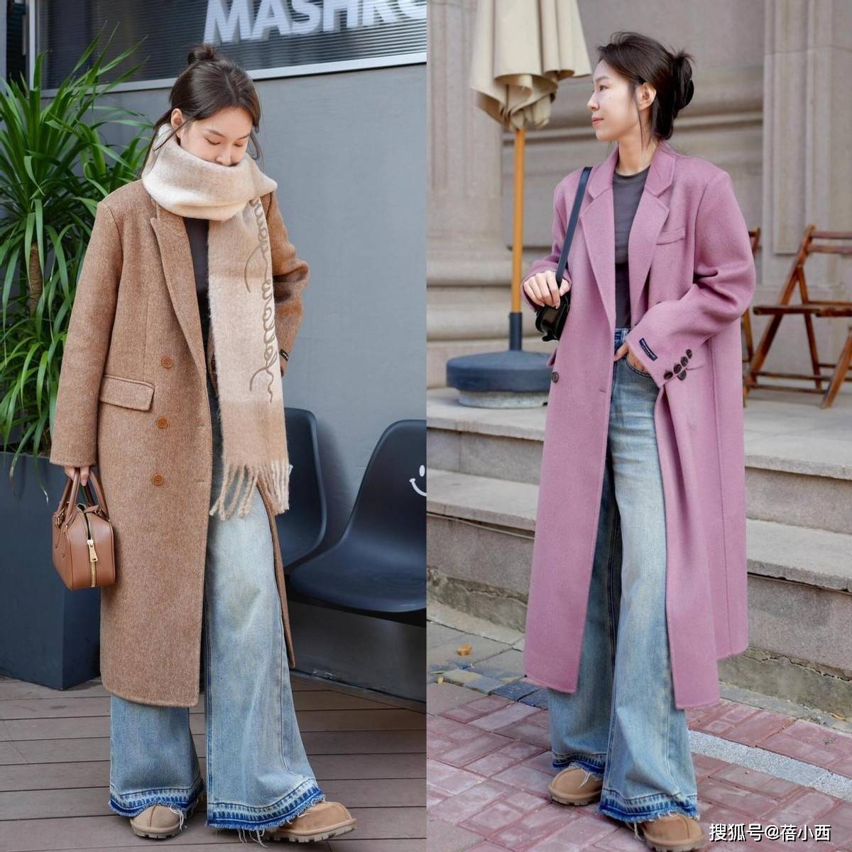 毛呢材質的大衣自帶高級感和優雅感,搭配一條挺括的牛仔闊腿褲,軟硬結合的材質對沖立馬就豐富了搭配,風格也變得更個性潮流,隨便一搭就很有回頭率。