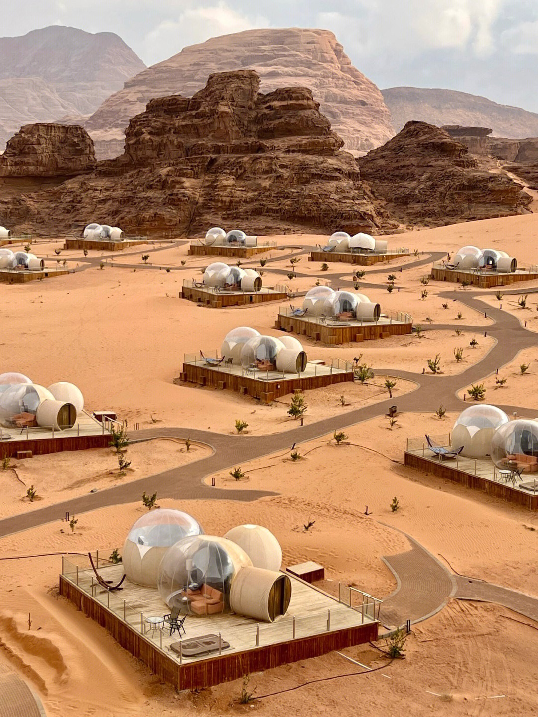 位於約旦的「Wadi Rum UFO Luxotel」座落在一望無際紅磚色的沙漠中,背後還有高聳岩石當背景,好像來到了外星人基地一樣,而且這裡最特別的就是「三球一體的氣泡帳篷」,看似小小間的又很簡約,但進去棚內可是別有天地~