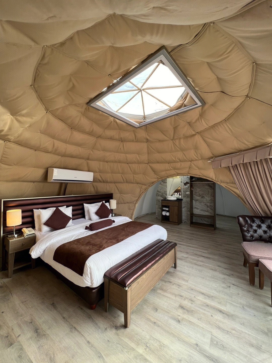 小小空間內其實設備非常齊全,不僅放得下大張的雙人床,裡面也有各種桌椅和小客廳,床上還有個四方天窗可以灑進陽光,晚上的時候還能仰望滿天星空,當然因為沙漠晚上環境較冷,一定有暖空調可以使用的啦~