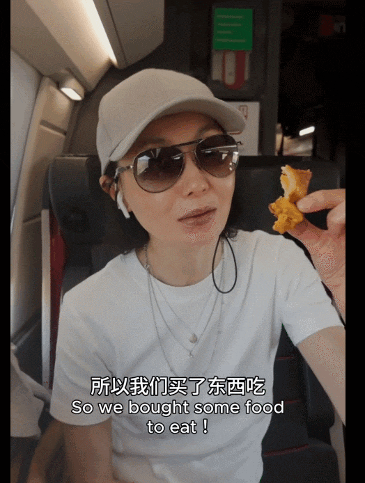後來火車晚點兩小時,她倒是一點不急,從包裡掏出提前買好的點心,對著鏡頭笑了笑說:「沒事,反正我們買了吃的。」