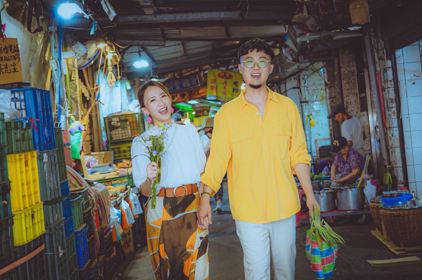 他們特別選在新店建國市場拍攝婚紗照,因為那是彼此初次約會的地點,「當天拍照的時候,天氣很好,但還是非常好玩,一邊拍照一邊認真買菜」,這種樸實的風格非常符合她注重CP值的客家個性。