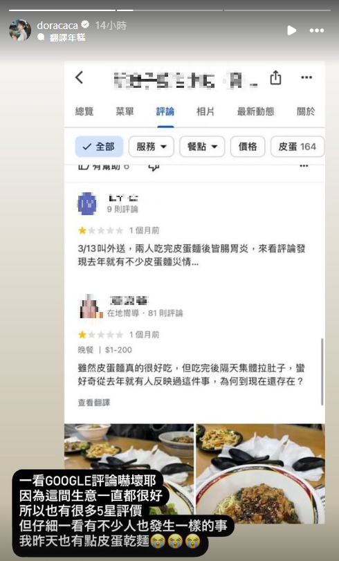 只是周宇柔後來去查了一下,該間麵店的GOOGLE評論,發現有2名顧客只給1顆星,其中一名留言「3月13日叫外送,兩人吃完皮蛋麵後皆腸胃炎,來看評論發現去年就有不少皮蛋麵災情…」,另一名則是留言「雖然皮蛋麵很好吃,但吃完後隔天集體拉肚子,滿好奇從去年就有人反映這件事,為何到現在還存在?」這點也讓她直呼:「我昨天也有點皮蛋乾麵。」尤其寶林茶室的食安風暴延燒後,如今疑似又有食安問題,讓很多人相當慌張。
