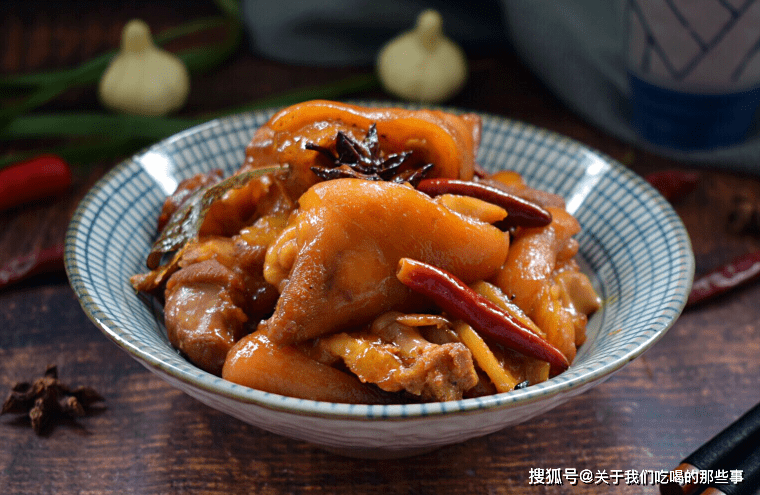 準備豬蹄、蔥姜蒜、八角、花椒、香葉、桂皮、乾辣椒、冰糖、料酒、生抽、老抽、食鹽、雞精、食用油。