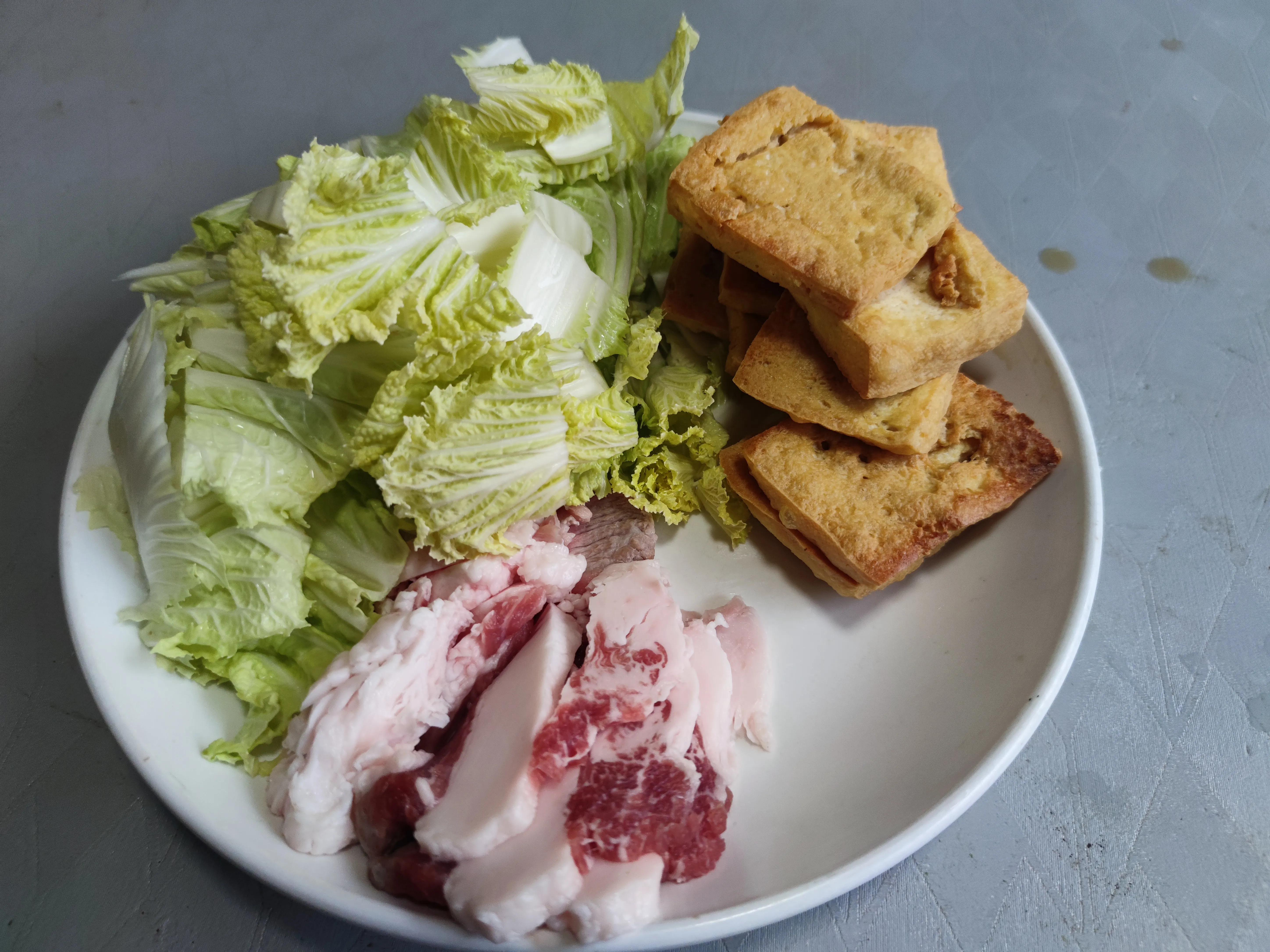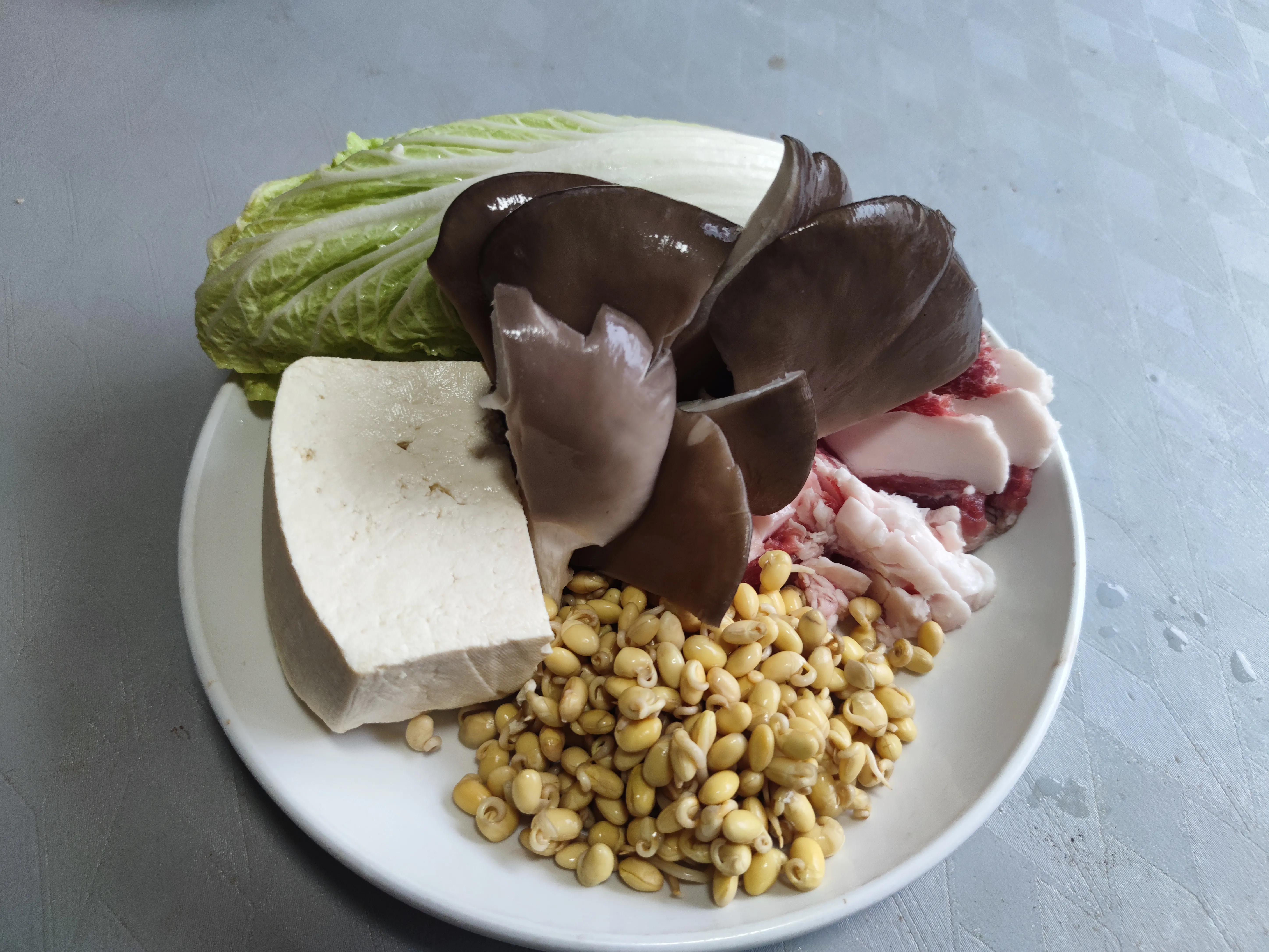 1.白菜清洗乾淨後把菜幫一片片掰下來,平菇去除根蒂清洗乾淨後撕成小朵,豆芽洗凈備用,五花肉切成薄片。