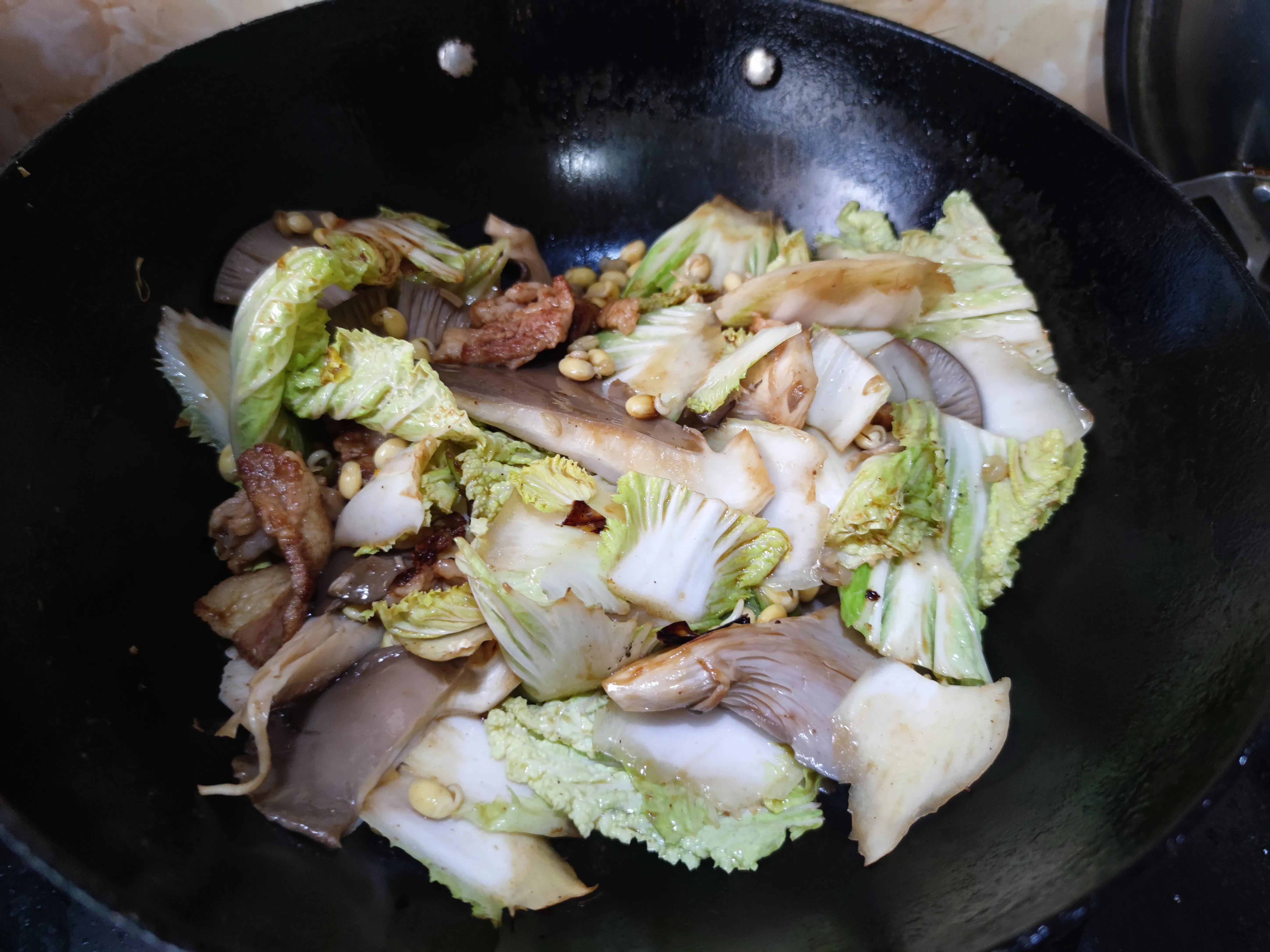 3.鍋中入油爆香蔥姜蒜和一瓣八角,下入五花肉片炒出油脂,烹入料酒和一品鮮醬油把肉片炒上色,然後下入白菜片炒至變軟,下入少許十三香和白糖炒出香味,然後下入豆芽和平菇翻炒均勻,添入適量湯汁。