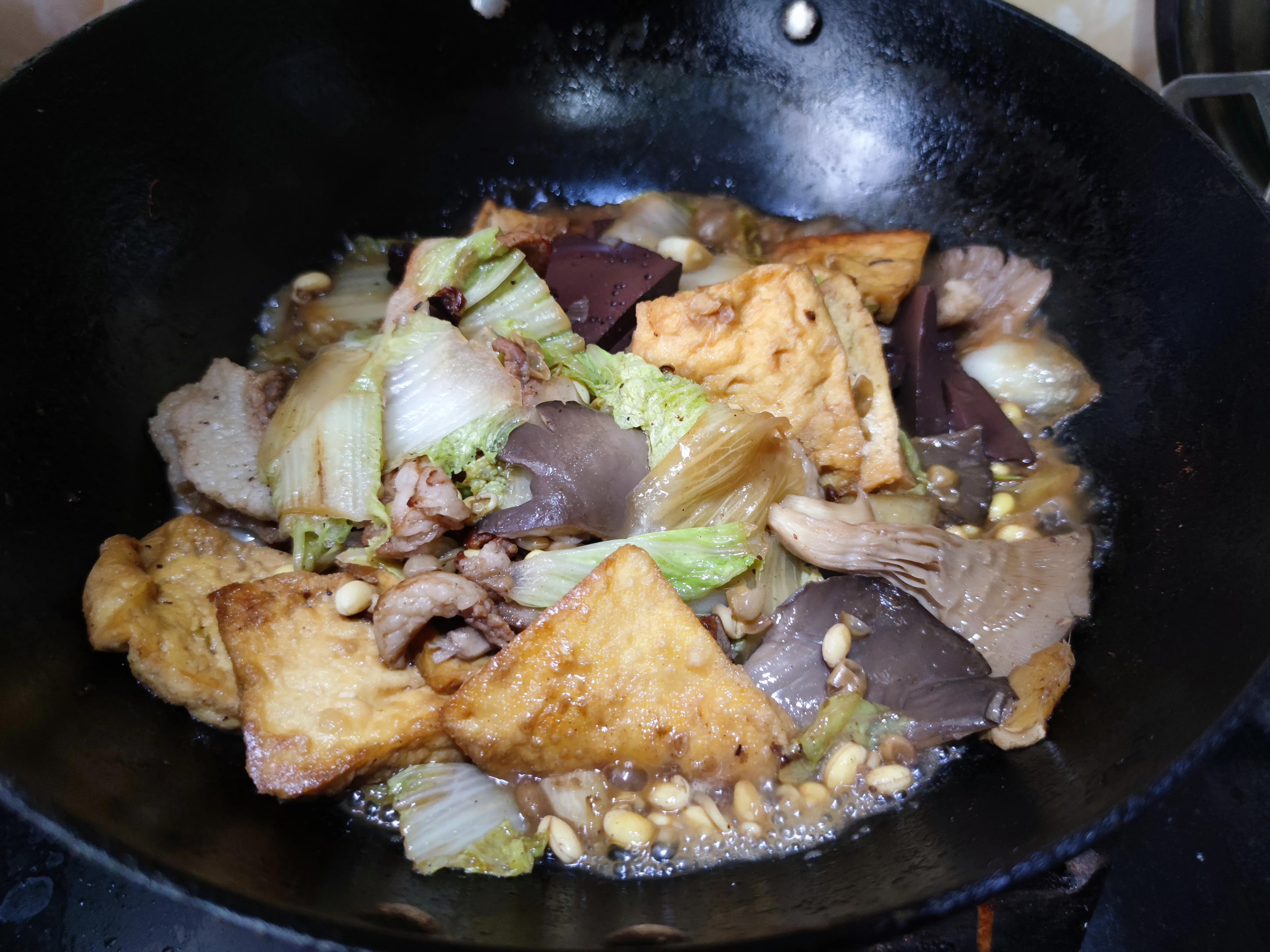 4.鍋中湯汁大火燒開後轉小火,然後下入炸好的豆腐,咕嘟到湯汁濃稠白菜軟爛後,加入鹽、胡椒粉和蚝油調味,開大火收濃湯汁,滴幾滴藤椒油即可出鍋。