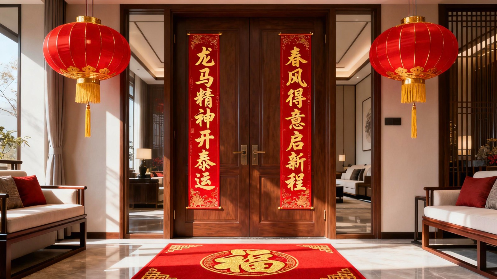 第一忌,上下聯貼反!這是最容易犯的錯,不僅鬧笑話,老輩人還覺得「因果倒置」不吉利。教你個超簡單的分辨法:看最後一個字的聲調——上聯尾字是仄聲(三聲、四聲,比如「壽」「富」),下聯尾字是平聲(一聲、二聲,比如「門」「安」)。貼的時候面對大門,傳統橫批從右往左讀就上聯貼右邊、下聯貼左邊;現代橫批從左往右讀,就上聯貼左邊,別搞混啦。