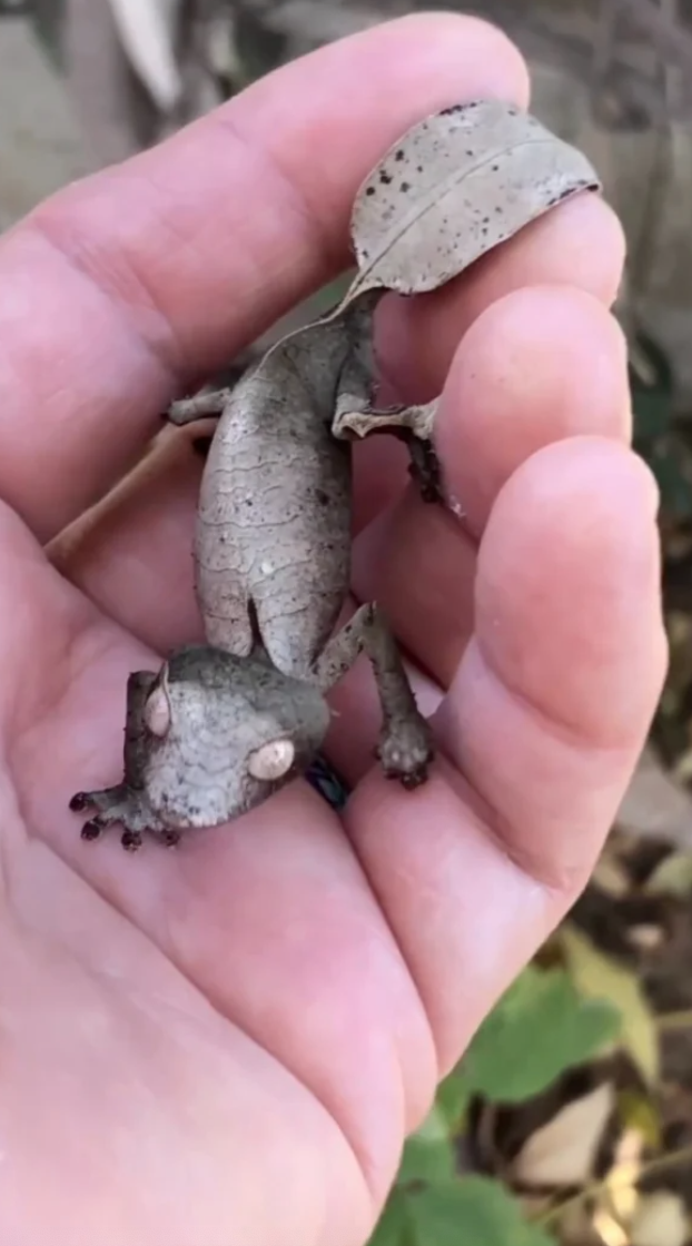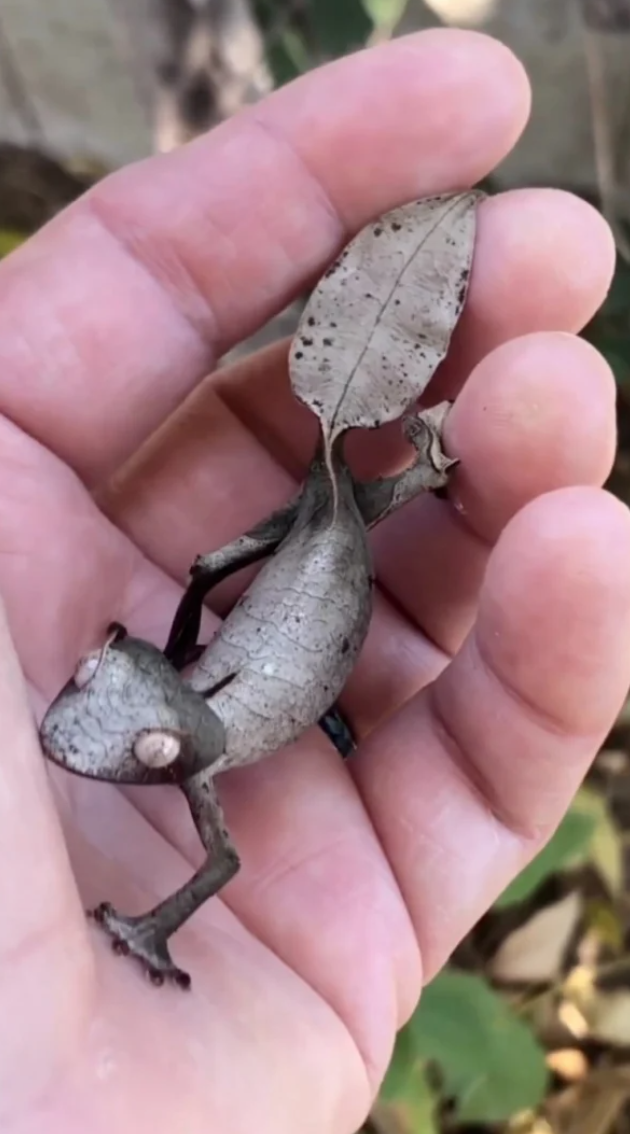 近期在微博上有隻影片爆紅,從影片中可見,手心上有個蜷曲的灰色小枯葉,仔細一看才驚覺這竟然是一隻活生生的小壁虎,不僅尾巴是扁寬的葉子狀,就連顏色都比一般壁虎還要深沉,又被稱作「角葉尾壁虎」、「葉尾守宮」等稱呼!