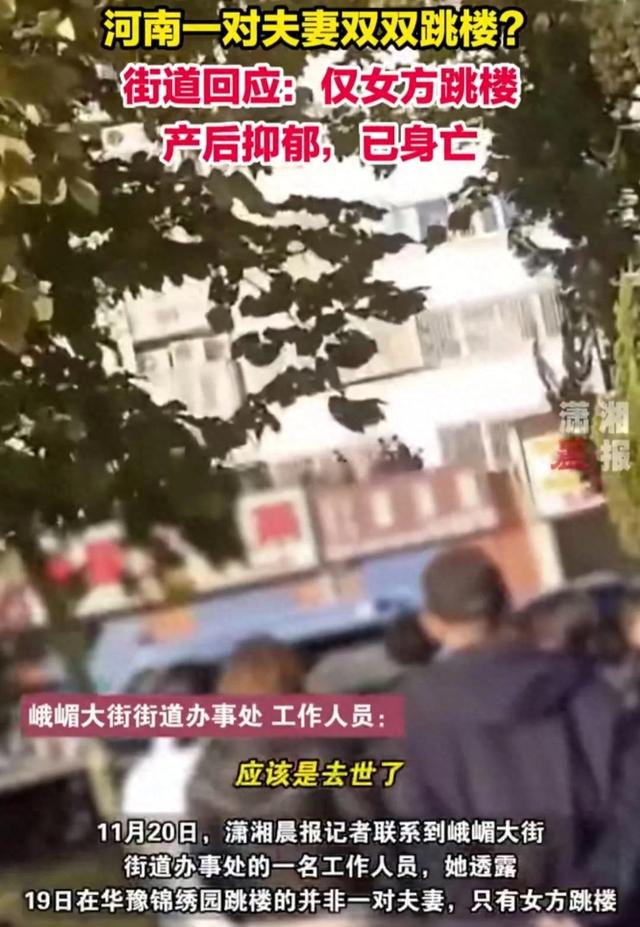 11月20日,小區的工作人員回應,只有女方跳樓,原因是產後抑鬱。
