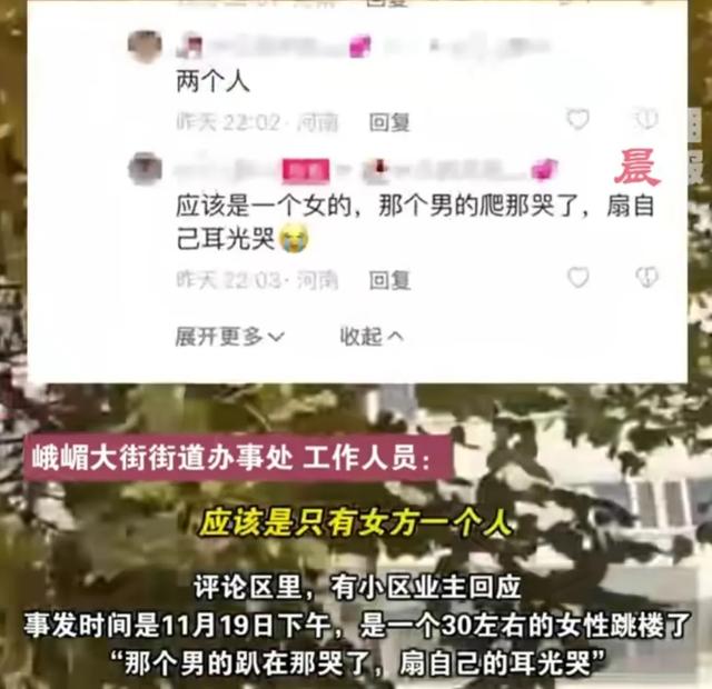 也有網友在該事件的評論區內回應,只有女方一個人跳樓,男方知情後跑到小區樓下,跪在妻子身邊大哭,狂扇自己嘴巴子。