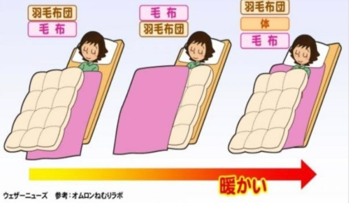過去曾有寢具品牌進行實際測試,結果顯示未使用保暖墊、直接在身上疊蓋毛毯與羽絨被,五分鐘後溫度僅上升約2度;若先蓋羽絨被再疊毛毯,五分鐘後溫度可提升約6度;採用「三明治蓋被法」先鋪設保暖墊、人躺上後依序蓋羽絨被與毛毯,五分鐘後溫度竟能飆升8度。品牌業者解釋,毛毯屬於聚酯纖維材質,透氣性較差,放在最外側能有效阻隔冷空氣、鎖住內部熱能。