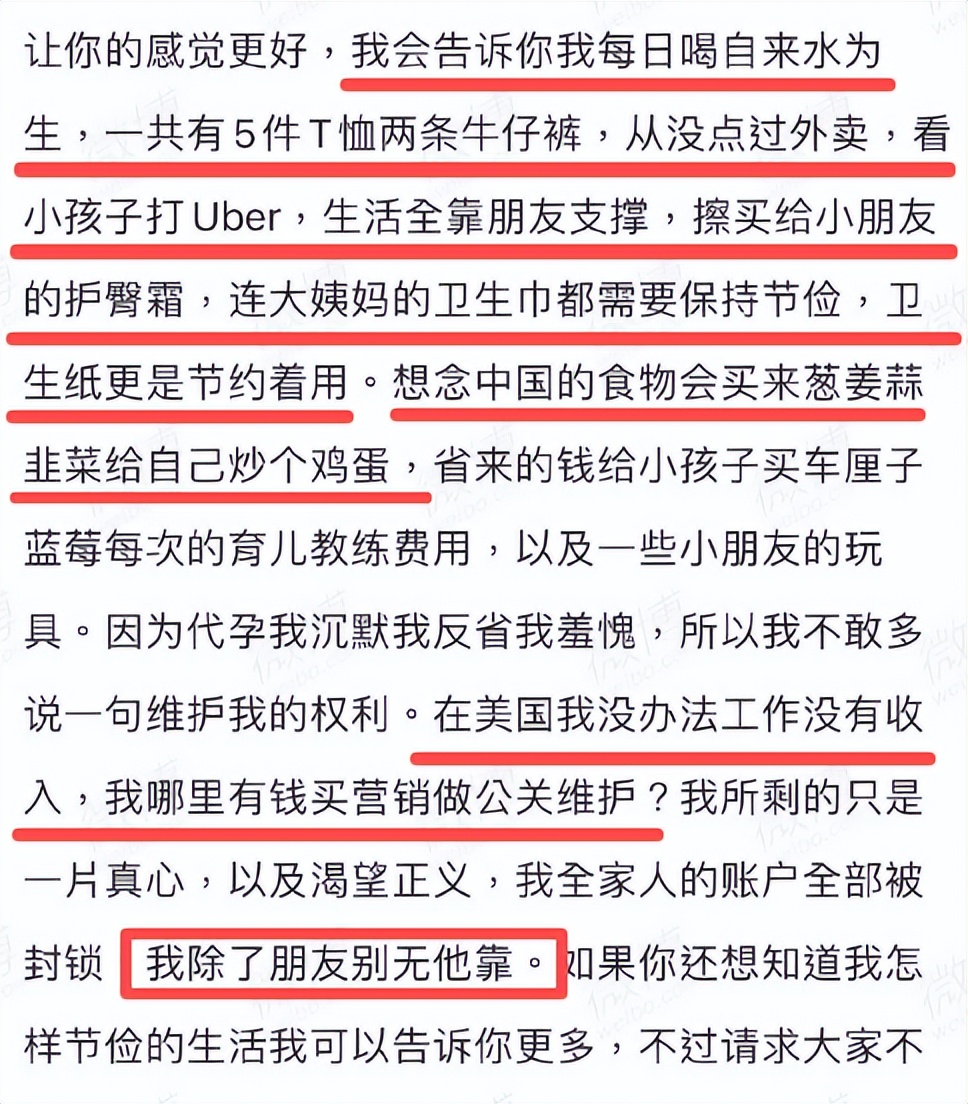 初入美國社會時,鄭爽確實遇到了很多困難,她曾發文訴苦稱由於家人的帳戶被凍結,只能靠朋友接濟,「每日靠喝自來水為生」,「去看孩子要叫車」,「護膚品是孩子的護臀霜」,「衛生巾、衛生紙要節省用」,「衣櫃裡總共只有5件短袖、2條牛仔褲」,餓了就自己炒韭菜炒雞蛋吃。