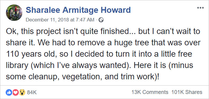 「這個計劃還沒全部完成,但我等不及要分享了。我決定把這棵樹改造成免費小圖書館,這是我一直都想做的事。」Sharalee將老樹上半部腐爛的部分砍掉,確保樹的生命力,將內部挖空、放入書櫃,添加屋頂和大門以及外部的照明設施。
