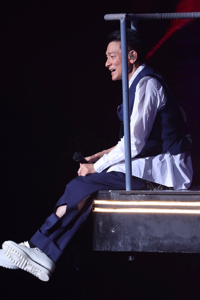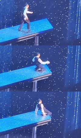據《自由娛樂》報導,劉德華在上海舉辦「今天...is the Day」巡演,演唱歌曲〈練習〉時,因為一個滑跪動作,險些從4公尺高台墜落,幸好華仔反應快,立刻用雙手按住兩邊,但影片中可見,劉德華的膝蓋已經懸空,令不少粉絲都捏了把冷汗:「你的安全才是最重要的!」、「這這這...命懸一線!」、「華仔別太拚了吧...」