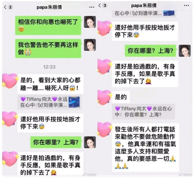 最後,向太提醒朱麗蒨、幫她留香港場次的票,朱麗蒨一口答應:「大家知道你和『牛』很熟啊,所以很多人去找你!」而她所稱呼的「牛」,似乎對老公劉德華的暱稱。劉德華也親自致歉,解釋沒想到會那麼滑,心裡也怕會滑出去,特別向粉絲們承諾,會好好照顧自己。而在演唱會上,華仔唱到〈17歲〉、〈如果有一天〉、〈掌聲響起〉等歌時,一時情緒激動、連話都說不出口,頻頻用手拭淚。
