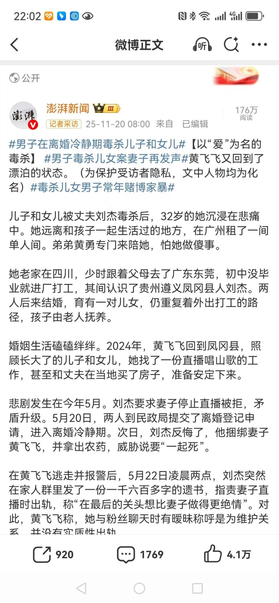 在黃飛飛逃走並報警後,5月22日凌晨兩點,劉傑突然在家人群裡發了一份一千六百多字的遺書,指責妻子直播時出軌,稱「在最後的關頭想比妻子做得更絕情」。對此,黃飛飛稱,她與粉絲聊天時有曖昧稱呼是為維護關係,並沒有實質出軌。