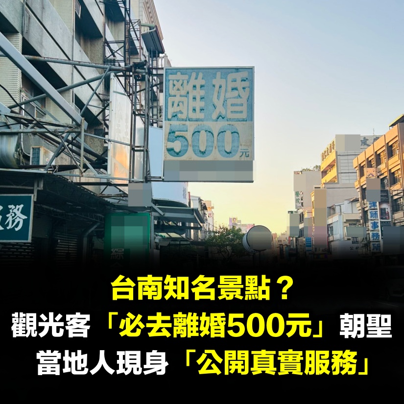 台南知名景點?觀光客「必去離婚500元」朝聖照曝光 當地人「公開真實服務」 力量人 2026-01-06 檢舉 這起「離婚招牌」爆紅事件,充分展現台灣街頭文化的獨特魅力。對台灣人來說稀鬆平常的代書店招牌,在日本遊客眼中卻成為新奇有趣的拍照景點。看來想吸引國際觀光客,有時不需要刻意包裝,最接地氣的在地風景反而最能引起共鳴。圖片來源:X不知道大家是不是都看過這個「知名地標」呢?資料來源:TEEPR亮新聞 Advertisements 回首頁 2/2 Advertisements 編輯精選推薦 More + 本土劇女星生了!7年前凍卵「終於來到我身邊」 歌手尪嗨喊:生個足球隊 晚年兒孫滿堂!73歲影壇大哥「拄拐杖現身」腳步蹣跚 兒子「全程攙扶不喊累」網羨:又帥又孝順 台灣大咖病逝「享壽83歲」!周遊告別式痛哭「認婚內出軌」:兒子很恨我... 弟成植物人、姊猝逝!玉女歌手「遭前夫設套」騙走娘家房產 「狠斬16年婚姻」近況曝 85歲失智父身亡!林葉亭突宣布「皈依佛門」 遇大師「開示一番話」忍不住淚崩 臨時找不到保母!女學生硬著頭皮「帶寶寶去大學上課」 教授霸氣伸手「寶寶我來抱吧」畫面超溫馨 台語歌后慟別摯愛!告別式上認「早隱瞞病情」 道歉哭喊:原諒我簽放棄急救 婚變尪落跑!單親媽「獨扛千萬債養孩」到處躲黑道 「一開口驚艷眾人」熬成台灣歌后 22歲愛女病逝!資深男星「走不出喪女痛」留白長髮現身 掛骨灰項鍊「代女做1事」惹淚 一家8口住飯店!月花16萬「連住3年還想續住」嗨喊省更多 知情人「曝內幕」:其實有房子住 無預警宣布喜訊!台語歌王「首曝光帥兒」有顏又有才 「考一次就上」網讚:虎父無犬子 最新/賈靜雯深夜慟曝「她已離世」 淚PO合照喊:真的好愛你... 65歲男星獨居暴斃!大咖女星放下恩怨「送前夫最後一程」 昔遭動手6年嘆「死者為大」 功德圓滿了!台語歌后「悲曝他離世」享壽95歲 淚喊:去當快樂的神仙吧... 空窗多年!68歲陳美鳳突羞認「身邊有個他」 40年前就認識「遭男方母親拆散」 趕在40歲前閃婚!八點檔女星「宣布嫁給他」 尪驚人身分曝「媒人是柯叔元」 15歲兒「睡夢中離世」!本土女星「送愛子火化」求做1事 「PO照圓滿了」:媽媽和你永不分開 相差18歲!58歲康康自爆「與老婆分房12年」驚呆眾人 提到沈玉琳「坦言罹同1病」:必須警惕... 以為只是小感冒!本土女星悲痛證實「他併發肺炎過世」 一度淚灑現場「後悔同意插管」 曾比江蕙紅!台語歌后「爆未婚生子」遭指指點點 「2次手術害癱瘓」72歲近況曝 老街的復古浪漫!斑駁牆面「百年建築咖啡廳」懷舊感滿滿 陳舊背景「配上時尚桌椅裝飾」超有文青感 24歲兒失明!于美人爆「他在飯店掃廁所」維生 不盼紅包只求「別再花我的錢」 放大版的大雞塊!主人打造「巨型6塊雞塊狗窩」送愛犬 超強細節「連麥當勞都大讚」送上驚喜回禮 腹痛緊急送醫!25歲女子開刀「取出1公斤黑球」 醫曝「真實病因」傻眼了:整個胃都堵住... 離婚11年!洪榮宏愛女結婚「終破冰前妻」 「2爸爸牽她進場」催淚畫面曝