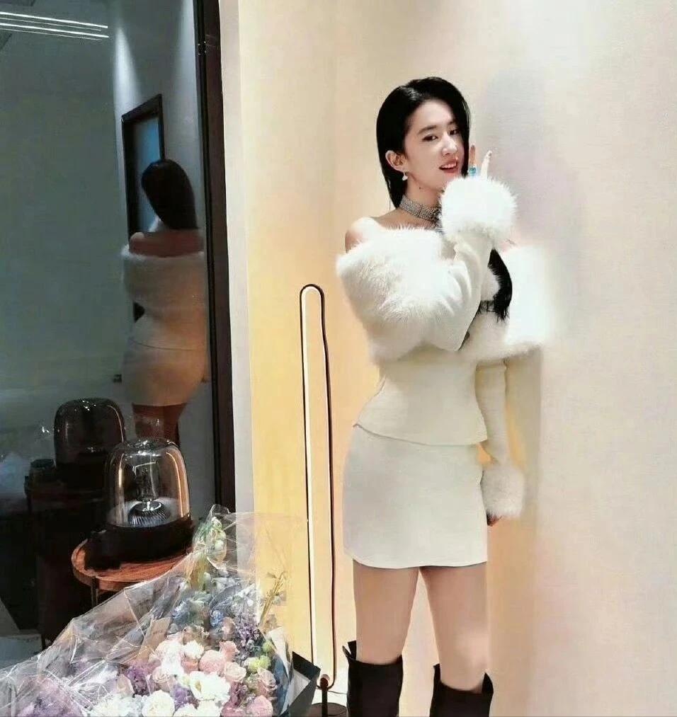 看看劉亦菲在家玩自拍的照片,穿著一套白色一字肩包臀針織小套裝,開心的靠著牆笑著比YA,不料卻被鏡子給「出賣」了......