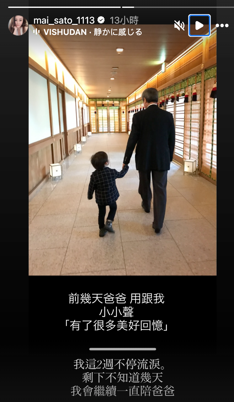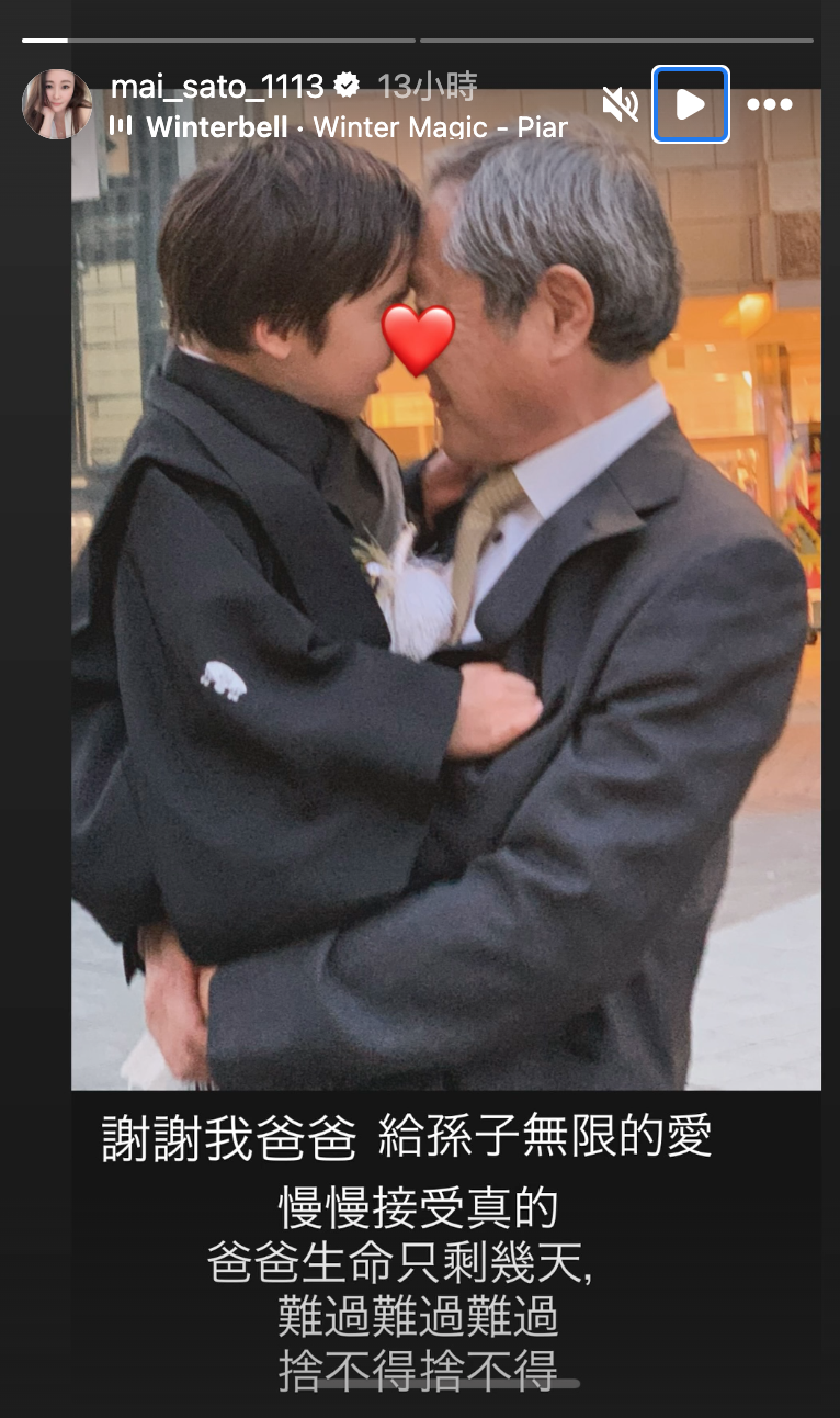 她透露,父親在5月時完成切除手術,但因為腫瘤癌細胞並未完全切除,因此仍在住院化療。然而,近日父親的病況卻進一步惡化,昨(23)日她也發布IG限動坦言,父親的生日已進入倒數計時,「謝謝我爸爸給孫子無限的愛,慢慢接受真的爸爸生命只剩幾天,難過難過難過,捨不得捨不得」。
