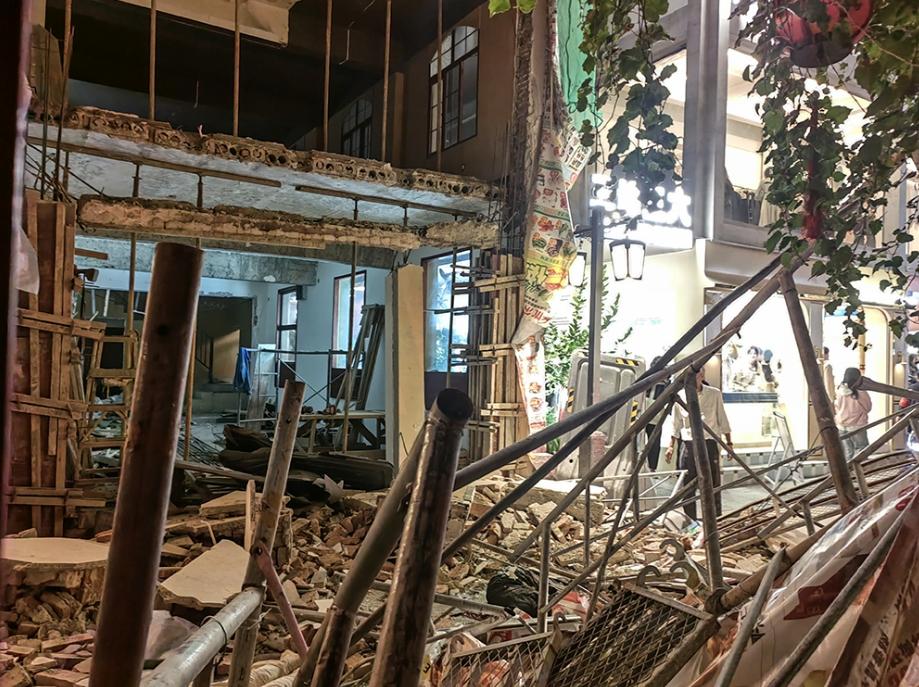 事發當晚8時許,涉事店鋪周邊50米範圍已被完全封鎖,警戒線外聚集了不少駐足的市民和遊客,大家紛紛議論著剛才的驚魂一幕。有市民用手機拍攝下現場畫面,視頻中可見店鋪的兩層外牆已完全垮塌,露出內部的預製板結構,裸露的鋼筋從斷裂處伸出來,地面上散落著磚塊、水泥塊和腳手架構件,救護車的燈光在夜色中格外刺眼。