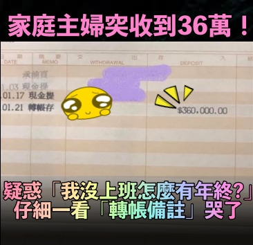 戶頭突收到36萬年終!全職媽媽「一刷存摺」滿頭問號 一看上頭「愛的備註」全網噴淚:太羨慕❤️