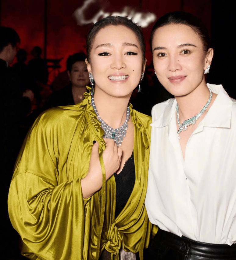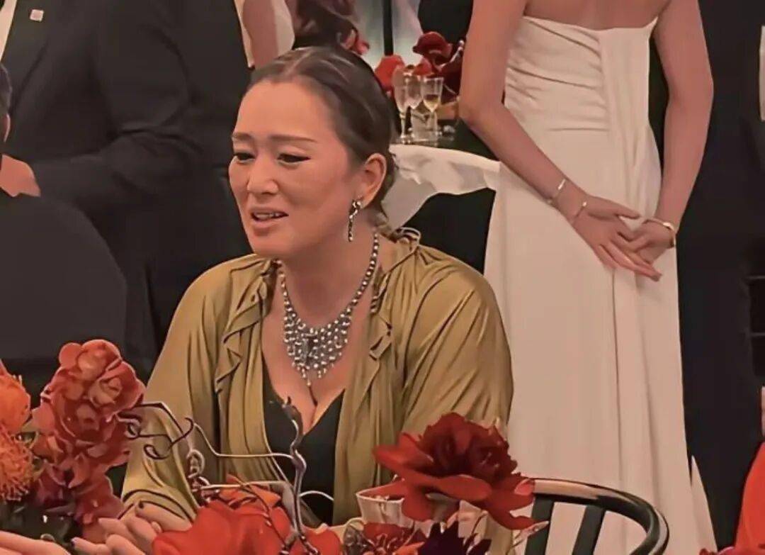 在一次品牌晚宴上,鞏俐依舊光彩照人。黑色V領裙搭配綠絲質上衣,珠寶項鏈一換再換,宛如一位優雅的貴婦。