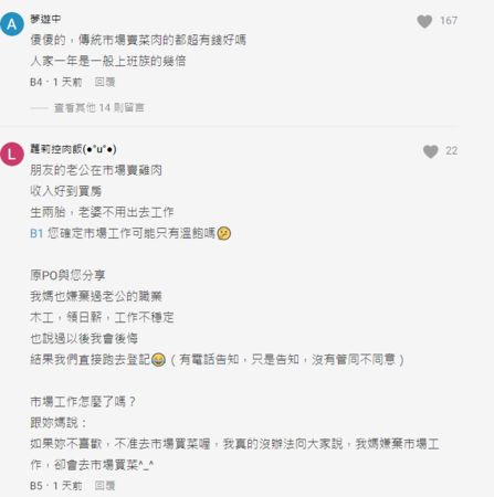 大部分網友都直呼原PO媽媽是不是不知道市場女婿的「行情」:「傻傻的,傳統市場賣菜肉的都超有錢好嗎,人家一年是一般上班族的幾倍」、「生意好的年收至少百萬還不用税」、「我朋友是豬肉販 他一個月花百多萬在玩手遊」、「朋友的老公在市場賣雞肉,收入好到買房、生兩胎,老婆不用出去工作」、「媽媽傻傻, 菜市場攤販都很有錢欸。」