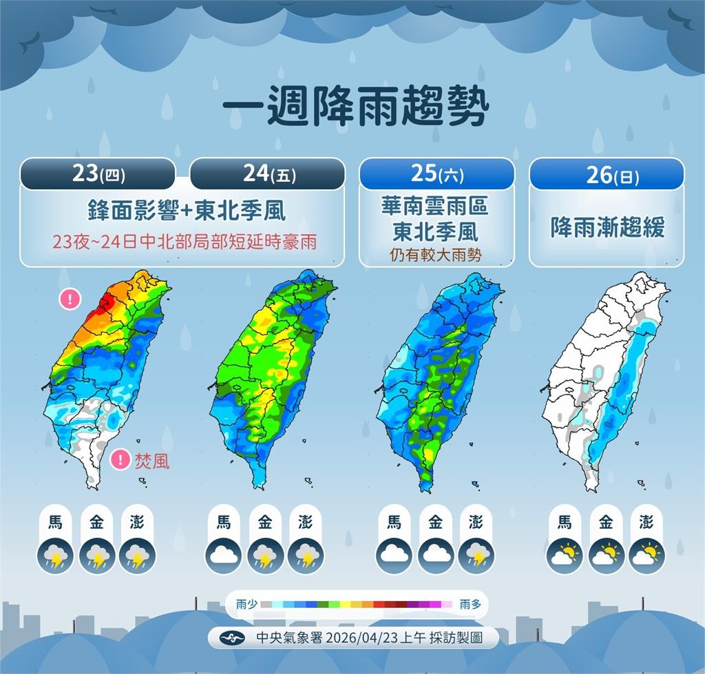 不過好消息是,週日、下週一兩天鋒面會逐漸遠離,天氣將轉為晴朗炎熱,氣溫明顯回升,僅東半部偶爾會有局部短暫降雨。下週二南方水氣會慢慢增加,各地大多呈現多雲時晴的型態,天氣偏暖熱,午後山區及東半部零星降雨機率提高。但到了下週三下午至週四,又有另一波鋒面快速掃過,天氣將出現驟變。