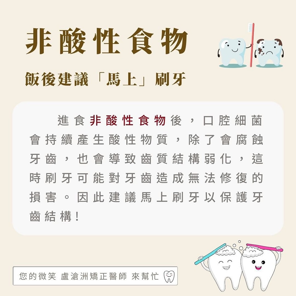 另外,他也提到吃「非酸性食物」的清潔辦法。盧滄州表示,食用這類食物後,口腔中的細菌會因應產生酸性物質,因此與前者的狀況極為相似,建議可以馬上刷牙因應,以保護牙齒結構作為主要任務。