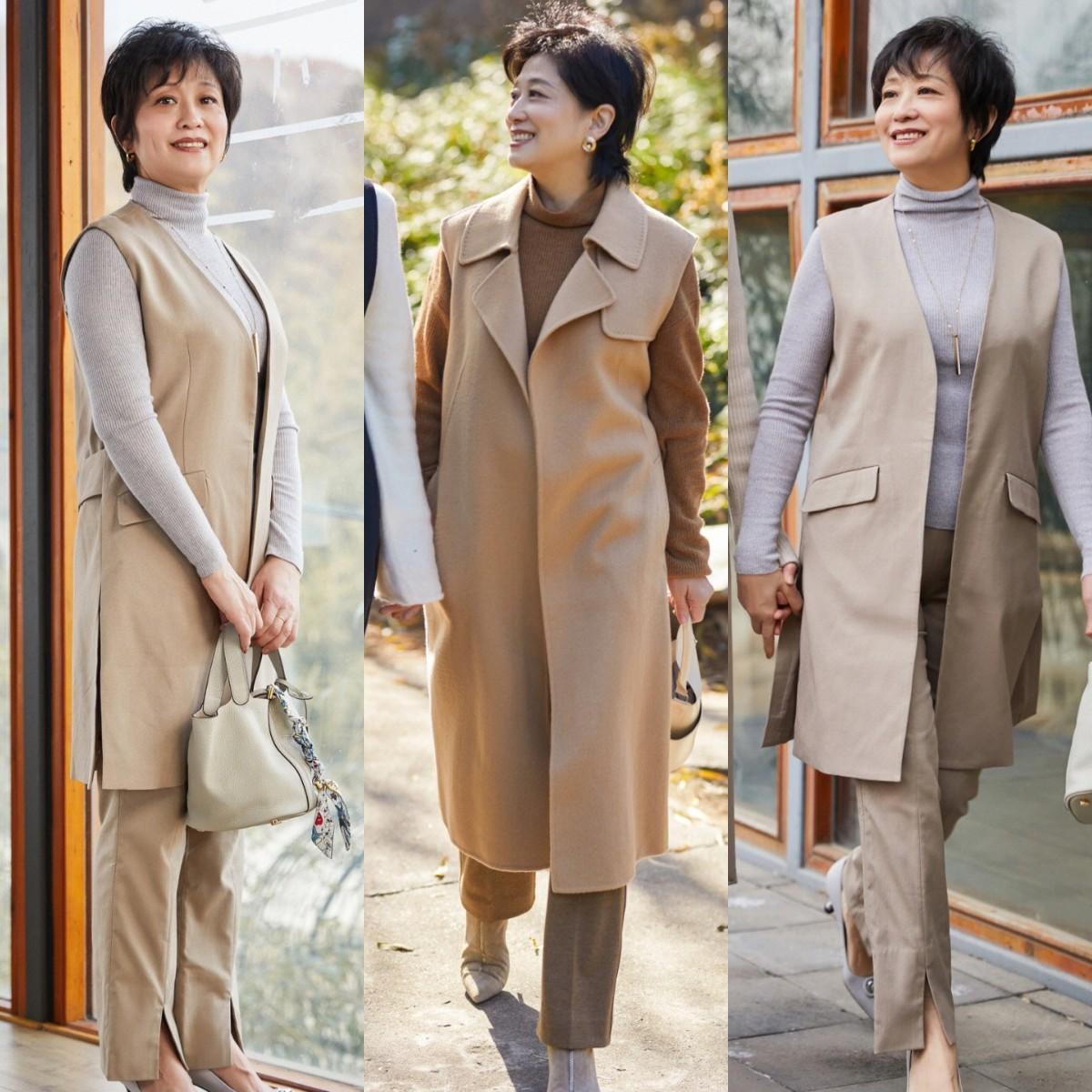 卡其色大衣馬甲+煙管褲: 知性氣場,適合辦公室和日常生活。