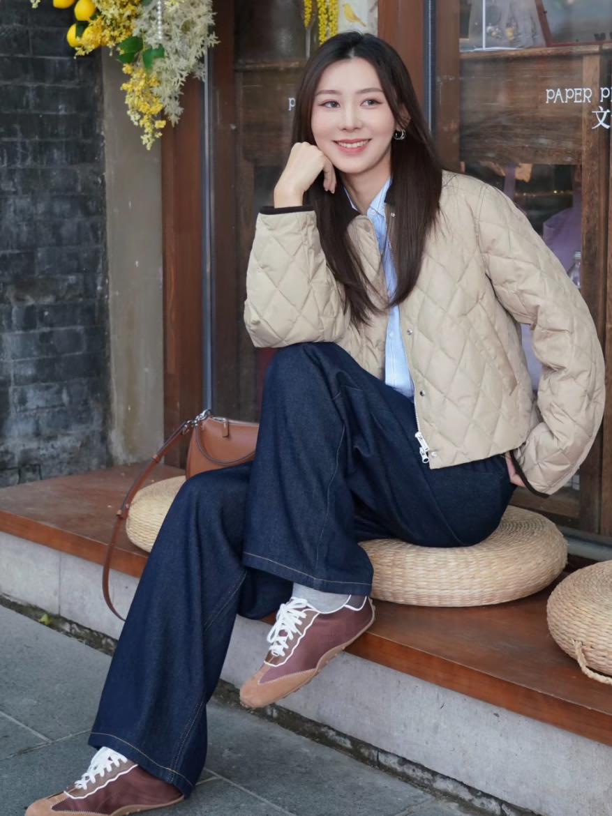 如果你看到長款或中長款的棉服,也建議你避開它們,首選短款版型,這不僅是為了之後生活中收穫短外套帶來的便利,更是因為上衣短,能自然地抬高身線,高腰線也會隨之打造出來,這對於腿短的人來說,簡直就是福利,顯高穩了。